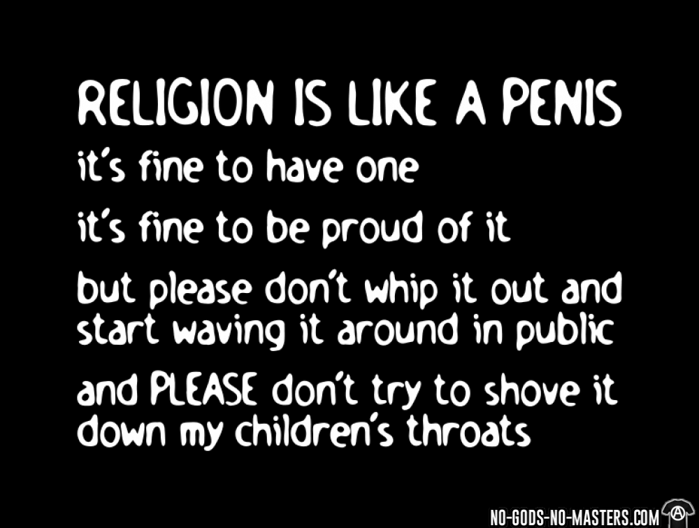 Előrebocsájtom, a vallásokkal kapcsolatban a véleményem lényege a következő, bármilyen vallásról is beszélünk: A vallás, olyan mint a pénisz Azaz tök jó, ha neked van és az is, ha erre büszke vagy. Viszont az már nem helyes, ha nyilvánosan lóbálod mások arcába, különösen, ha gyerekekről van szó!