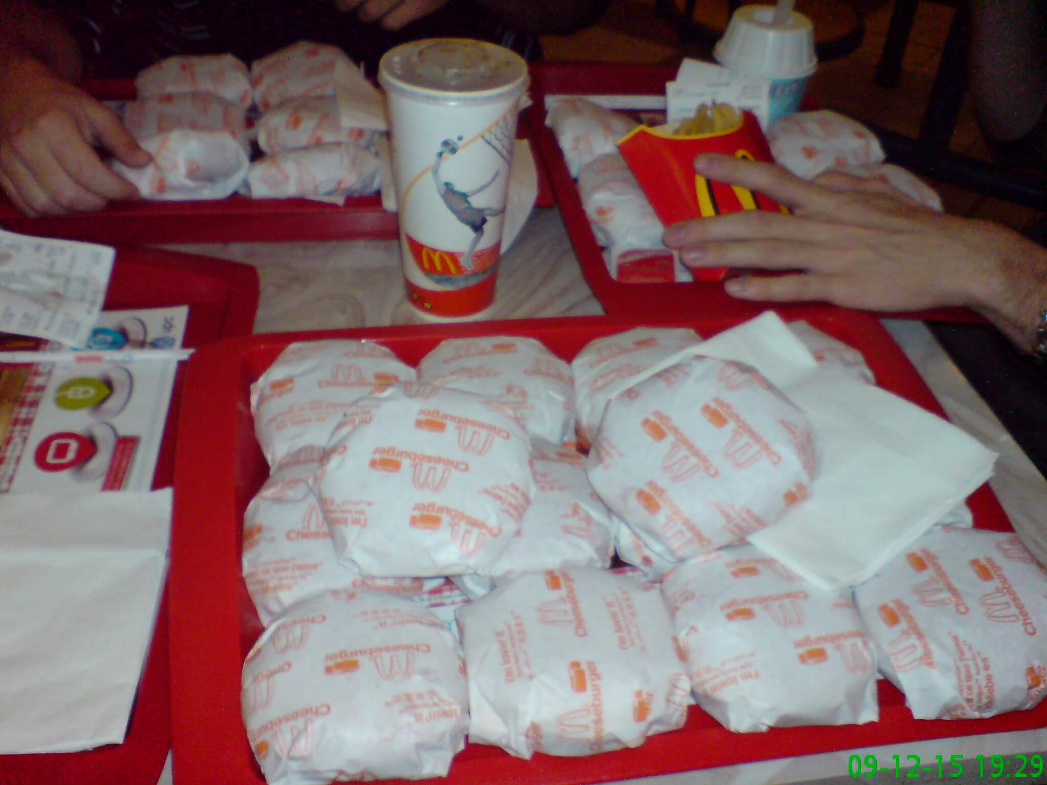 Innen már nem nehéz összerakni, hogy mi következik: természetesen a buli végén is nálunk volt, amikor megéheztünk. Szépen összeálltunk négyen, a megfelelő ember tartotta az ajtót, "begördültünk" a kiadó pulthoz és a mekis csávó lefagyott. Szerintem látott már pár kretént hajnal háromkor a mcdriveban, de ilyet még nem. Aztán persze nagy röhögés közben kiadta a rendelést, de szerintem a mai napig emlegeti a dolgot.